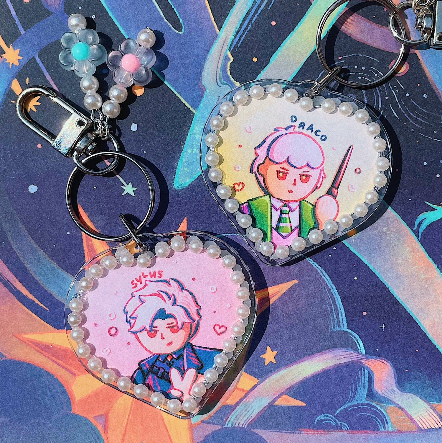 A new sticker sheet, a sweet beaded bow charm and a magical acrylic keychain with epoxy resin