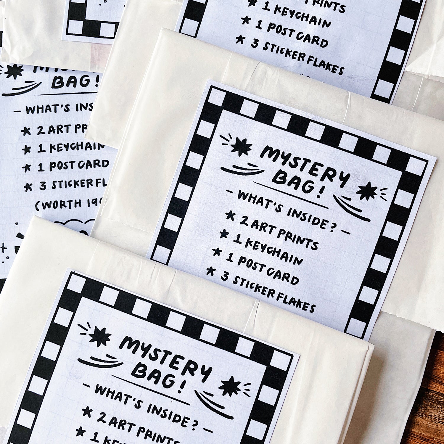 The mystery bag includes 3 die-cut stickers, 2 A6 postcards, 1 A6 sticker sheet and 1 acrylic keychain.